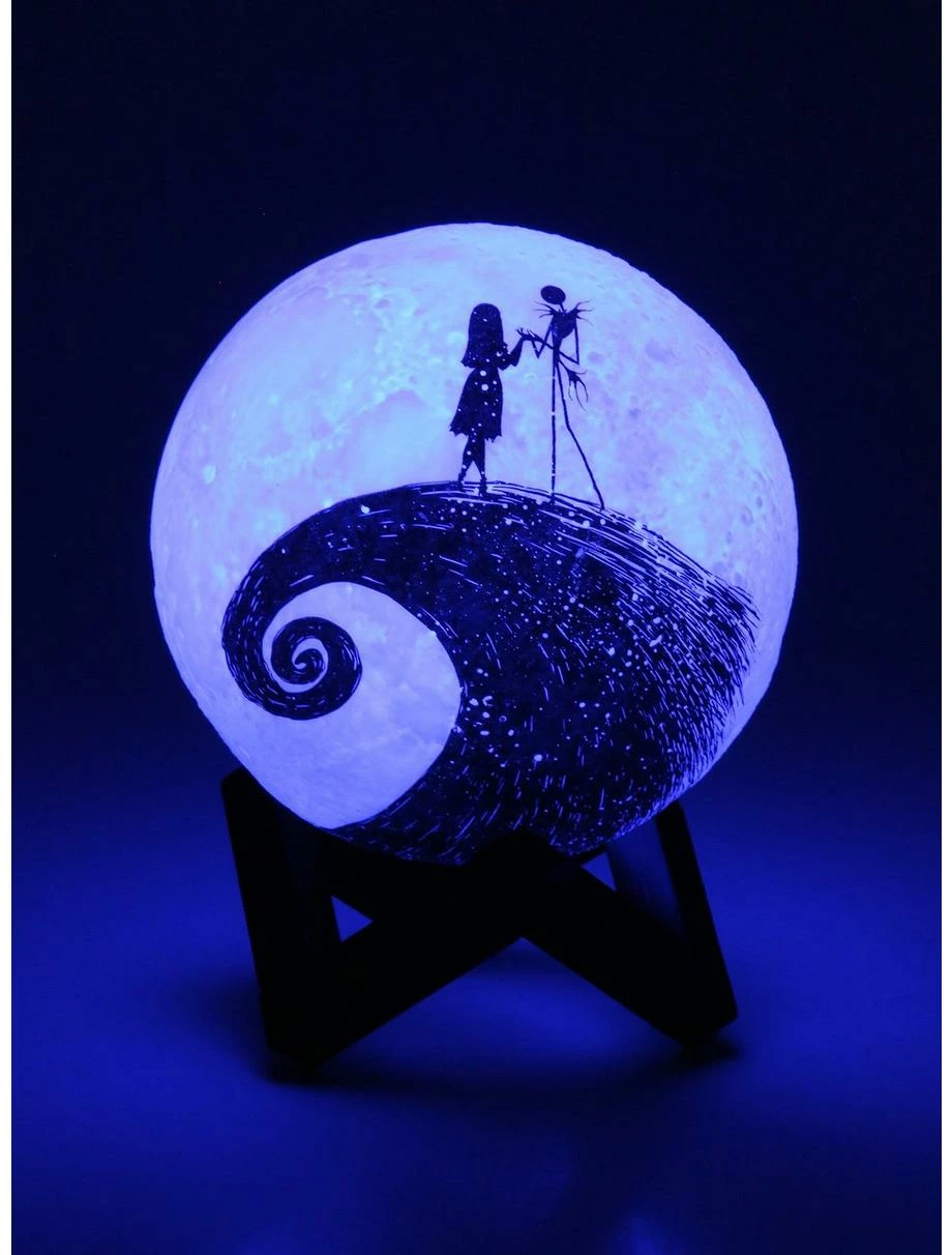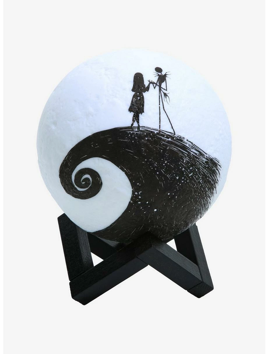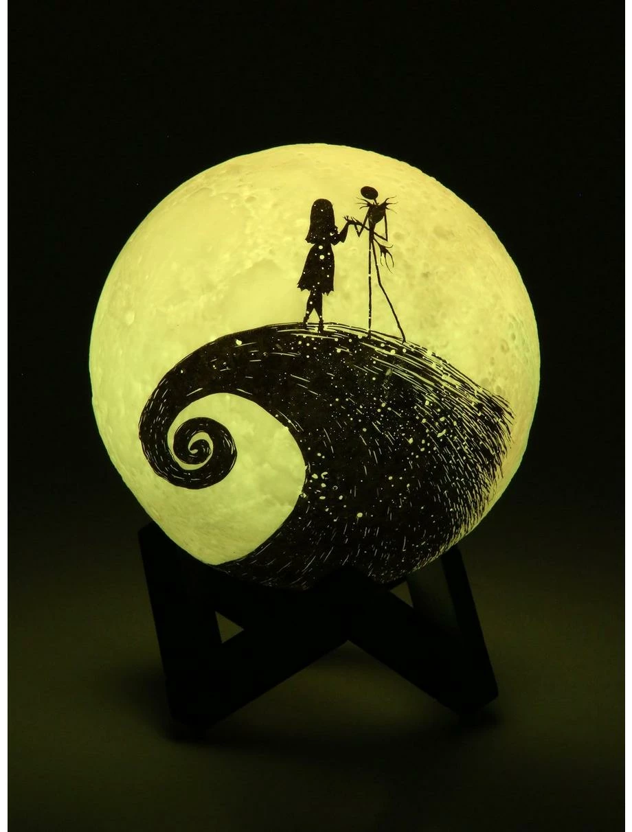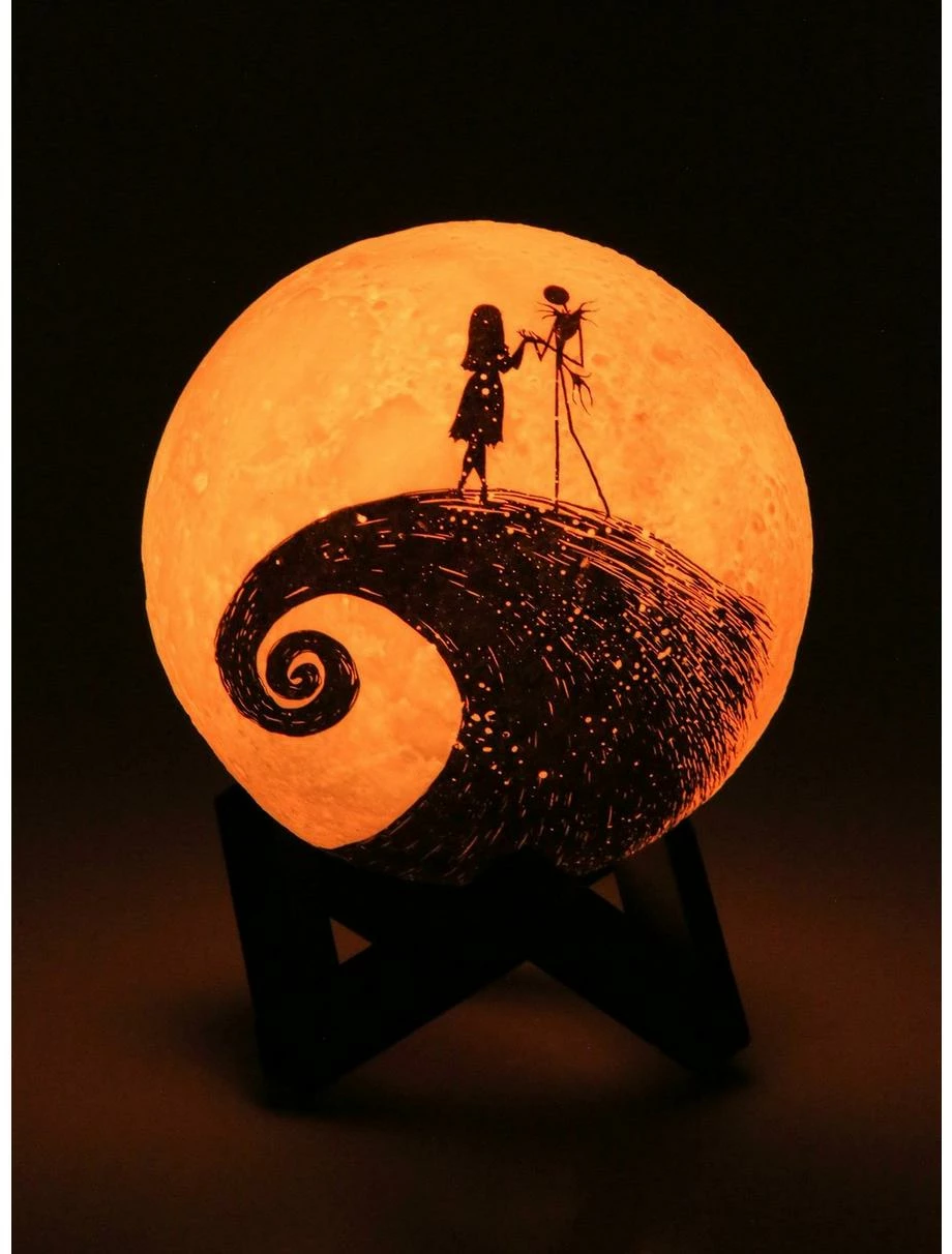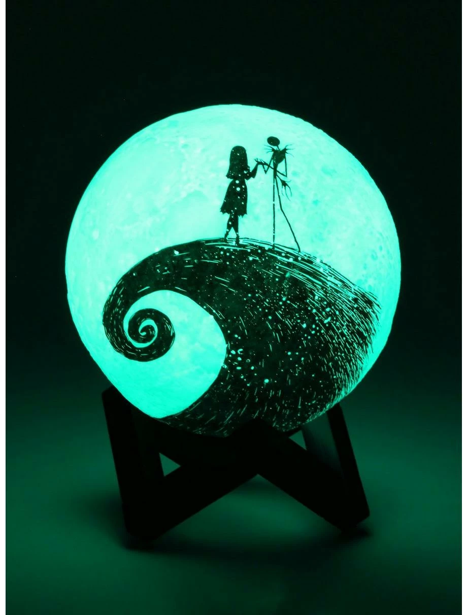 Set the spooky mood with a little help from this Nightmare Before Christmas mood lamp! With a figural moon design, Jack Skellington and Sally appear as silhouette graphics on the front of this color-changing light. Perfect for adding a Disney touch to your ghoulish indoor decor. Also includes stand.